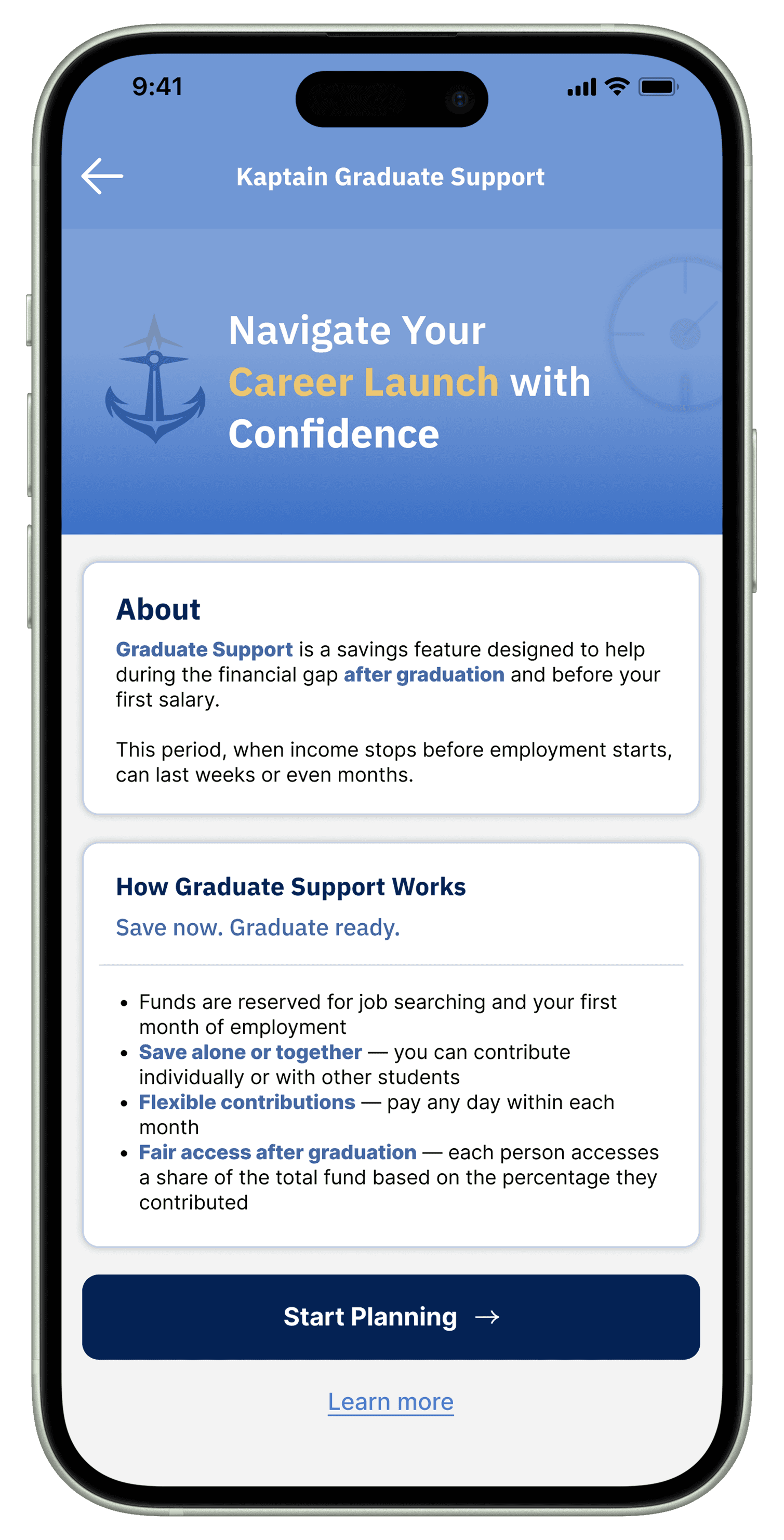 That reframing is where Graduate Support's real differentiation lives. Not in features that competitors lack, but in an intention that competitors don't consider. A savings account built specifically for the post-graduation gap, that students begin contributing to before they graduate (individually or with peers) gives a familiar product a clarity of purpose that the existing landscape misses.