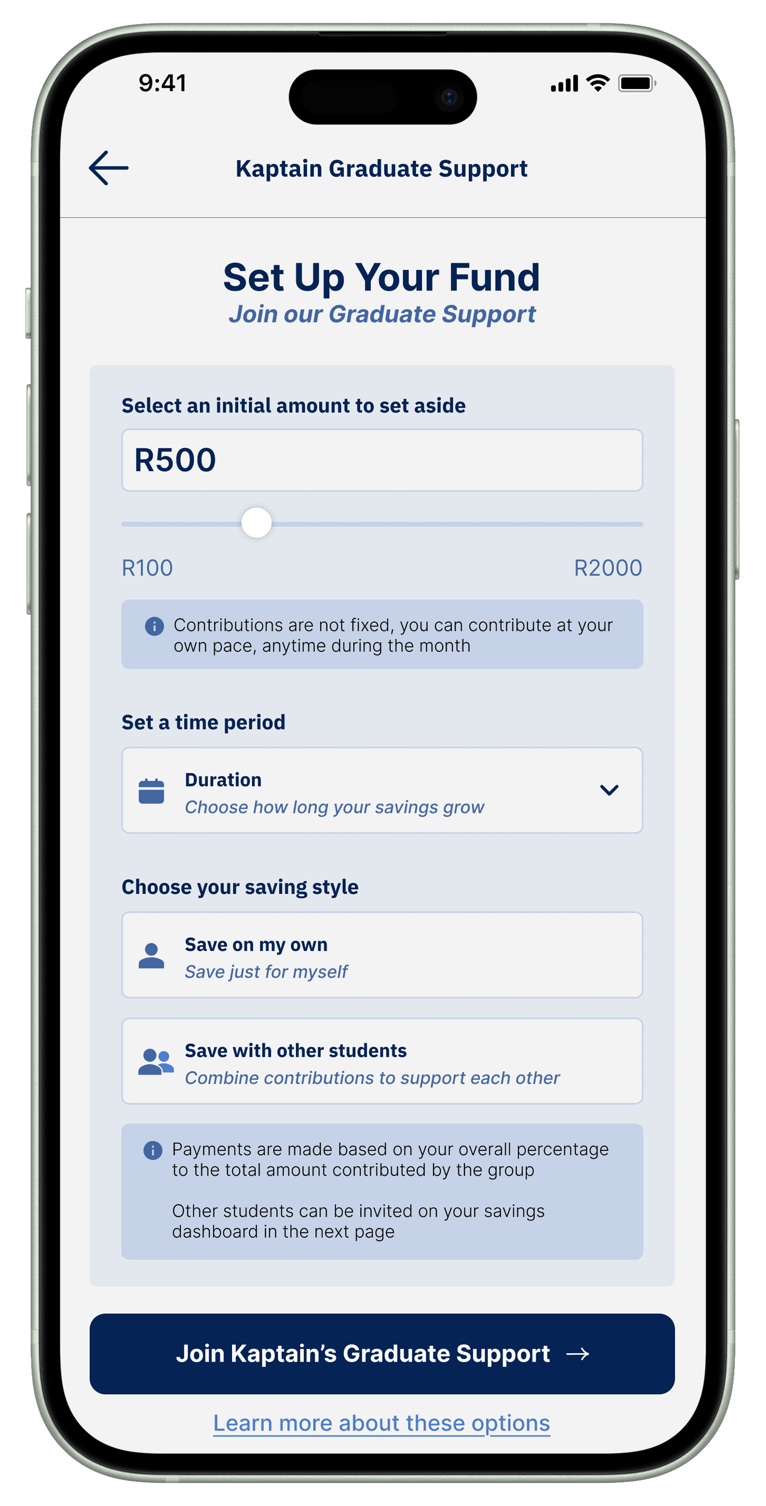 Secondly, the collective savings model raises questions I didn't resolve. What happens when a member drops out of the group? What happens when someone can no longer afford to contribute? What happens when group members are in different years of study with different graduation dates? A future iteration would need to resolve these problems explicitly, with clear terms the user understands before they join Graduate Support.